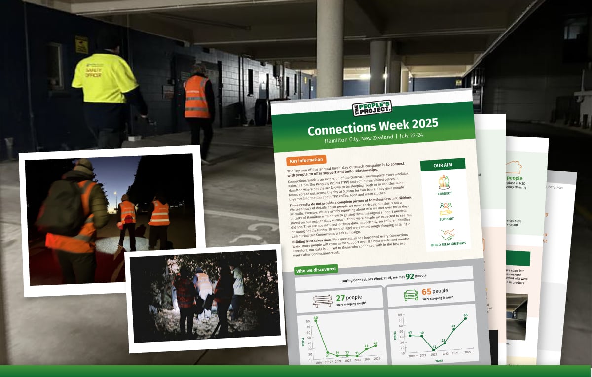Connections Week 2025 took place on July 22-24. Kaimahi from The People’s Project (TPP) and volunteers visited places in Hamilton where people are known to be sleeping rough or in vehicles. Nine teams spread out across the city at 5:30am for two hours. They gave people they met information about TPP, coffee, food and warm clothes.